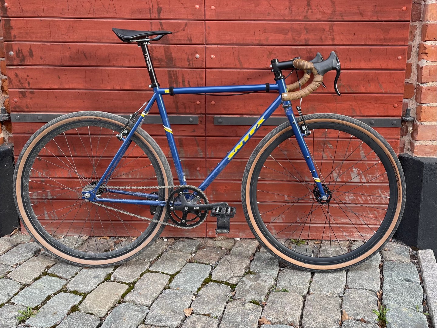 The Santa Fixie Wild is based on a tracklocross frame which is something between a track bike, a CX bike and in this case a gravel bike. Possibilities are endless if you want to play a bit with your bike setup. It’s a steel frame which makes it a bit heavier than aluminum frames but much more durable, this one is absolutely bombproof and I always thought that it I would hit a wall with it, I would probably go through it without a scratch.